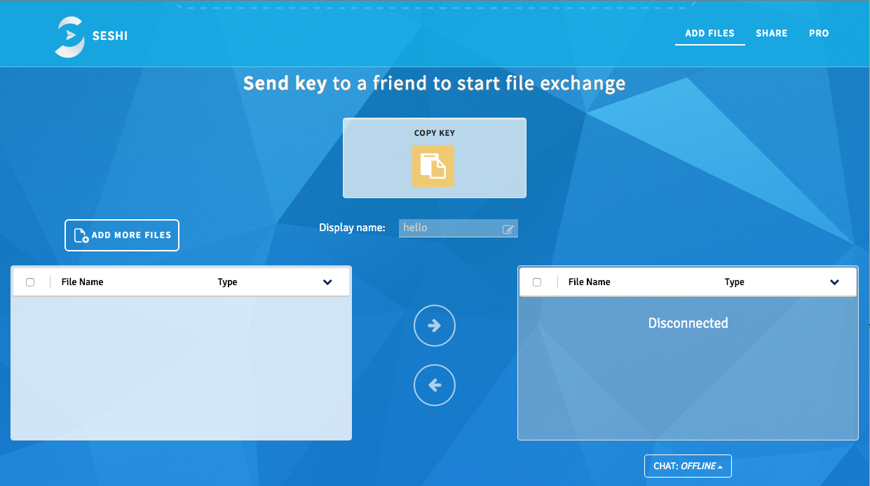 The user can generate a url key and send it someone via email or social network sites like Twitter or Facebook, so both can start sending each other digital files.