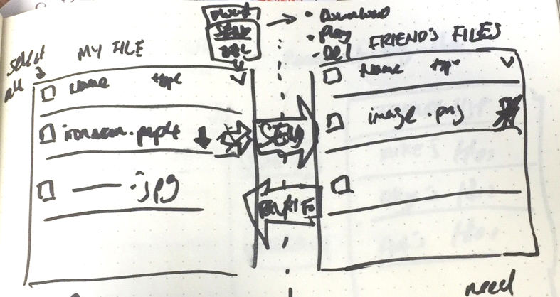 I took a bit of inspiration from former file transfer software like Napster and Limewire. In the mockup, I used arrows to indicate the sending and pulling of files.